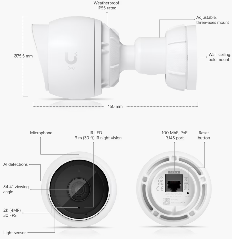 Cámara G5 Bullet 2k (4MPX), 30 FPS, para exterior (IP55 y IK04). Con micrófono y visión nocturna IR hasta 9 mts con detecciones inteligentes.
